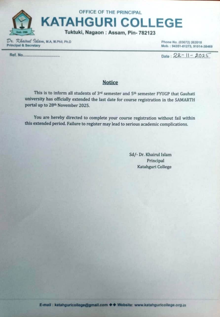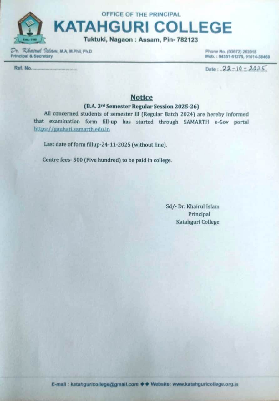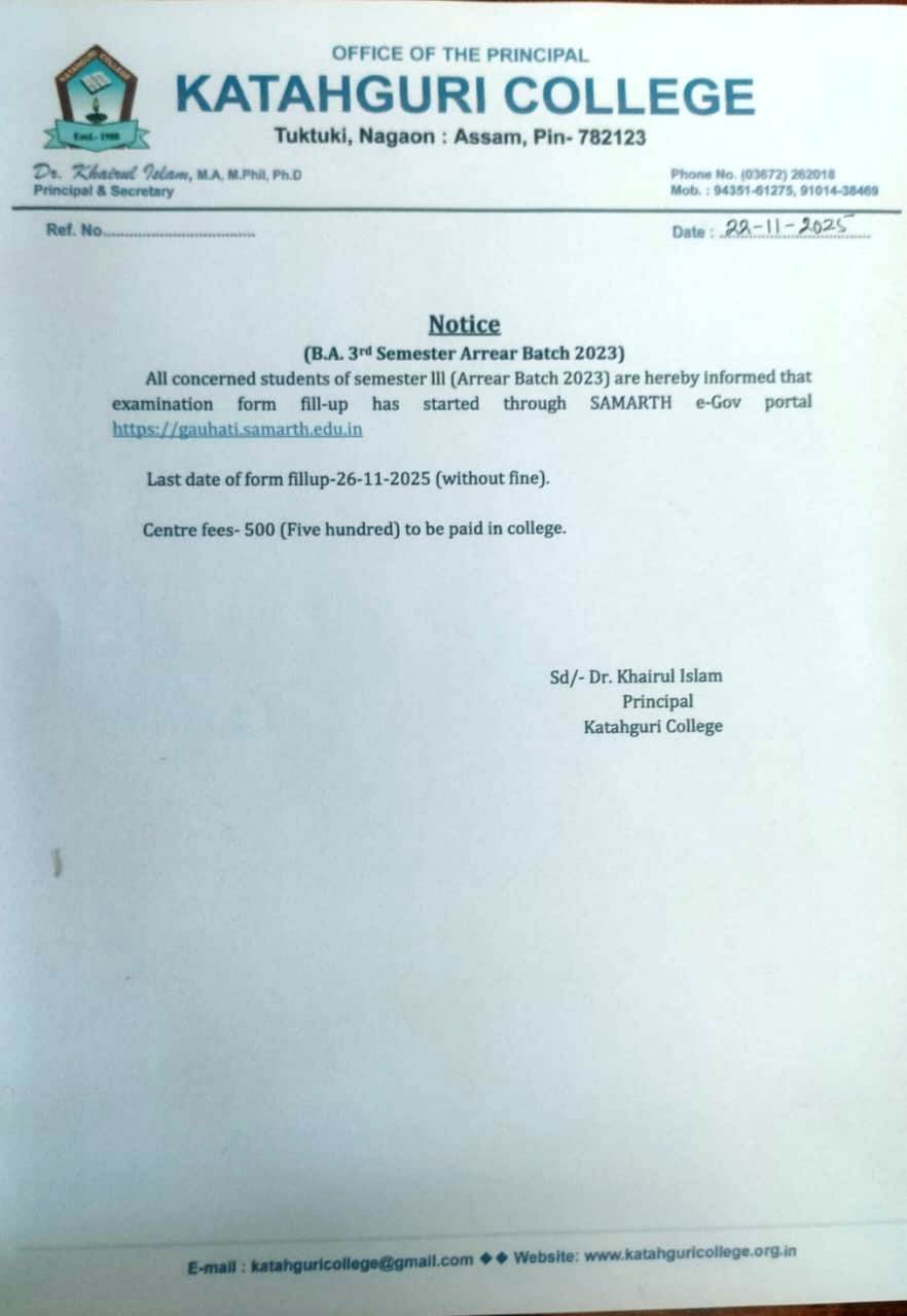 This is to inform all, the Katahguri college students who graduated in the session 2024-25 that the Govt. of Assam has launched Chief Minister's Jibon Prerana Scheme. Interested candidates may apply in the following link. https//dids.assam.gov.in