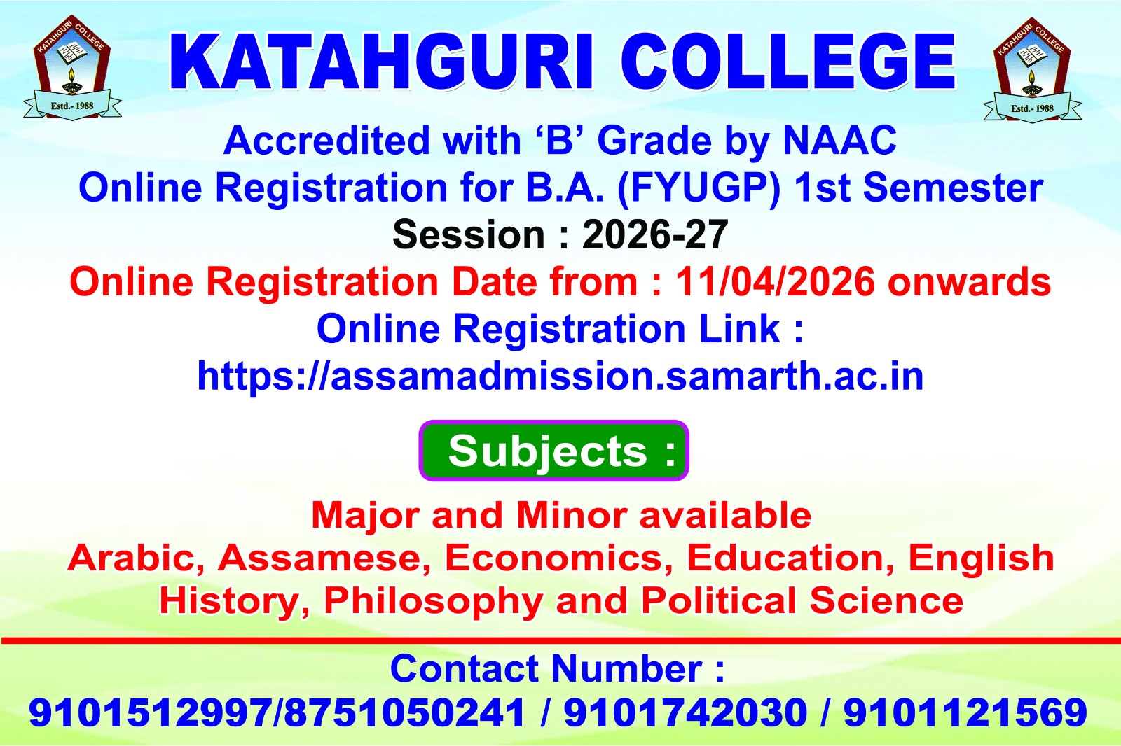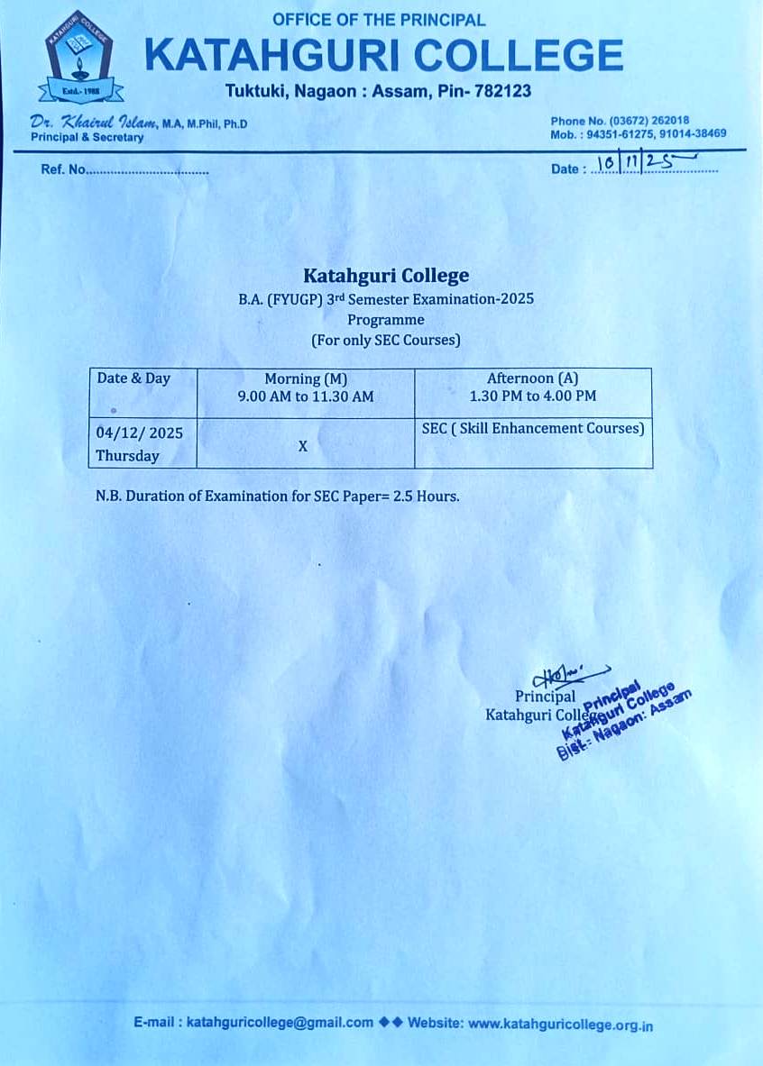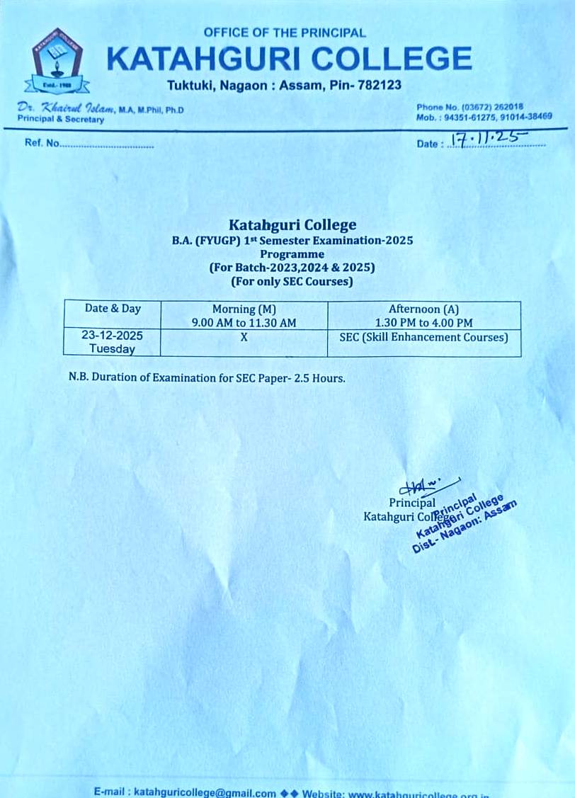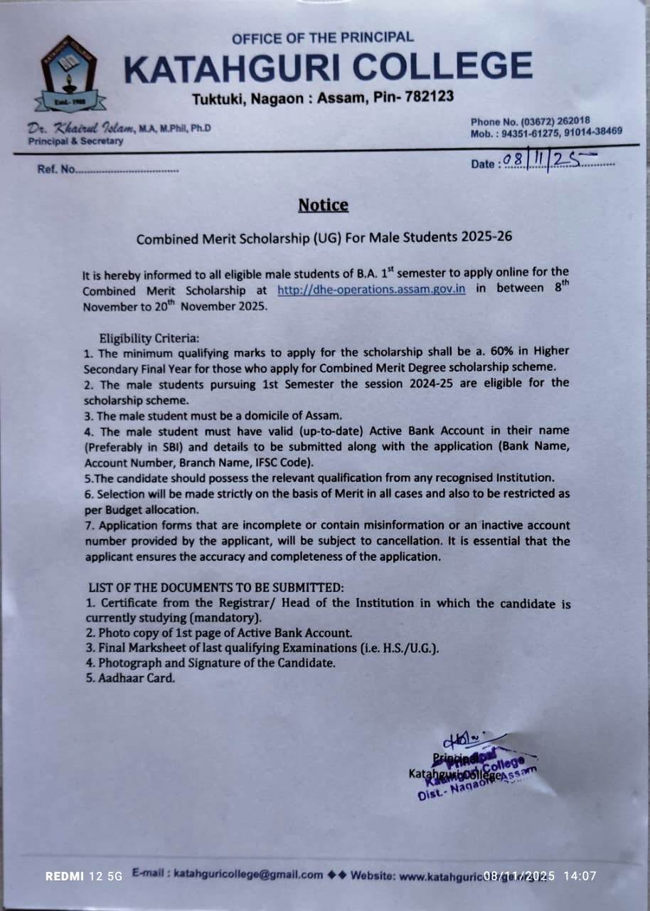 This is to inform all, the Katahguri college students who graduated in the session 2024-25 that the Govt. of Assam has launched Chief Minister's Jibon Prerana Scheme. Interested candidates may apply in the following link. https//dids.assam.gov.in