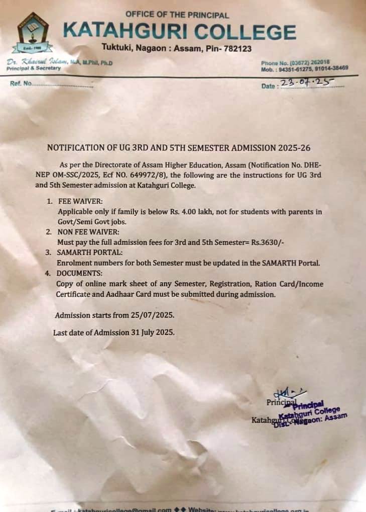 Spot Admission Notification from Katahguri College for the session 2024-25.