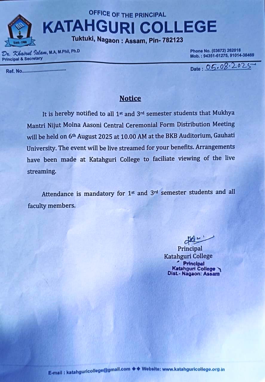 All 1st and 3rd semester students are asked to present in the live streaming of the Ceremonial distribution of Mukhya Mantri Nijut Moina Asoni on 6th August, 2025 from 10:00 AM onwards...